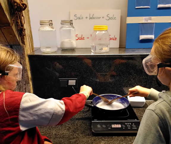 Der zweite Teil der Führung entführte die Familien in die Geschichte der Salzproduktion. An der Saline sowie in den historischen Räumen der Saline erfuhren sie, wie in früheren Jahrhunderten Salz durch aufwendige Verdunstungsverfahren gewonnen wurde und wie Salz damals den Lebensalltag der Menschen prägte.